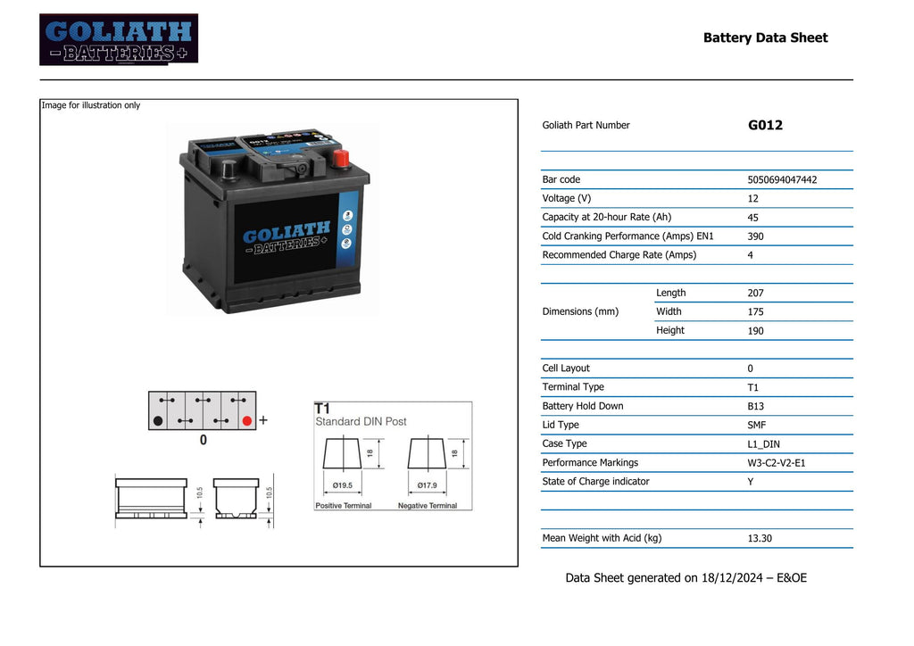 Goliath G012 - 012 45Ah 390A Battery - 3 Year Warranty