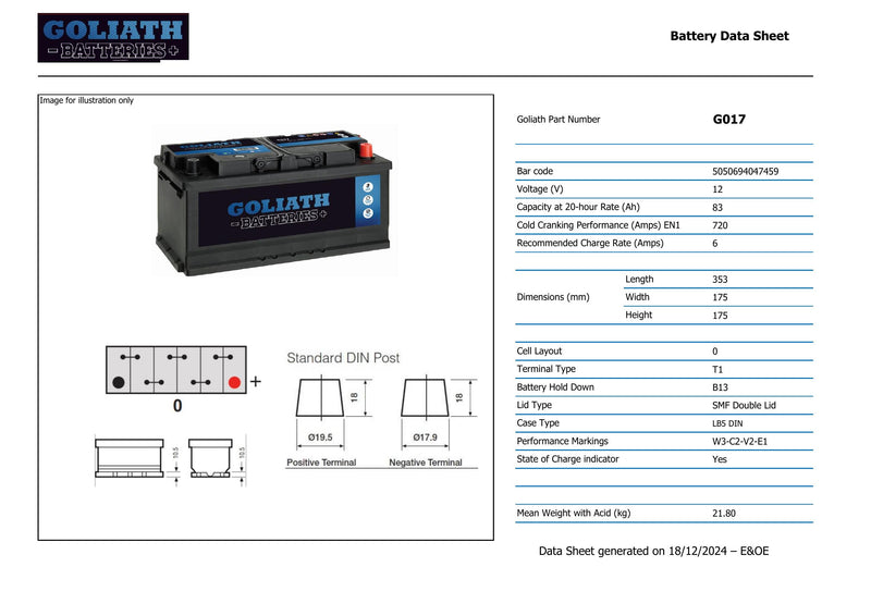 Goliath G017 - 017 83Ah 720A Battery - 3 Year Warranty