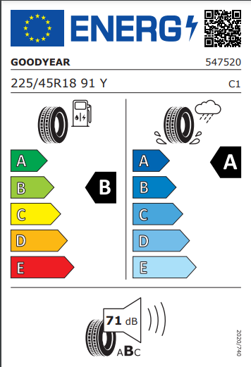 About this tyre - Size - 225/45/18 91Y, Fuel Efficiency - B, Noise (dB) - 71, Wet Grip - A, Runflat - NoAs the only component on your vehicle that actually makes contact with the road surface, tyres are critical for safety when driving.How do you read the markings on a tyre?The markings on a tyre indicate its size, load index and speed rating. A typical tyre marking looks like this - 205/55 R16 W 91. What is the UK legal tyre limit?The minimum tread depth required by law in the UK is 1.6mm. This applies to the central three-quarters of the tyre’s width and its entire circumference. Many car manufacturers, however, advise changing your tyres once the tread is down to 3mm to be on the safe side. What are tyre speed ratings?A tyre speed rating is the maximum speed a particular tyre is legally approved for. The rating is represented by a letter displayed on the tyre sidewall. It will always be the last letter in the sequence.