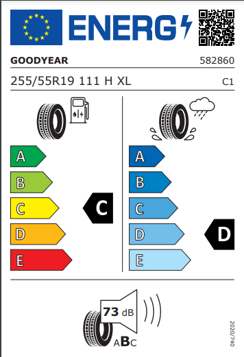 About this tyre - Size - 255/55/19 111H, Fuel Efficiency - C, Noise (dB) - 73, Wet Grip - D, Runflat - NoAs the only component on your vehicle that actually makes contact with the road surface, tyres are critical for safety when driving.How do you read the markings on a tyre?The markings on a tyre indicate its size, load index and speed rating. A typical tyre marking looks like this - 205/55 R16 W 91. What is the UK legal tyre limit?The minimum tread depth required by law in the UK is 1.6mm. This applies to the central three-quarters of the tyre’s width and its entire circumference. Many car manufacturers, however, advise changing your tyres once the tread is down to 3mm to be on the safe side. What are tyre speed ratings?A tyre speed rating is the maximum speed a particular tyre is legally approved for. The rating is represented by a letter displayed on the tyre sidewall. It will always be the last letter in the sequence.
