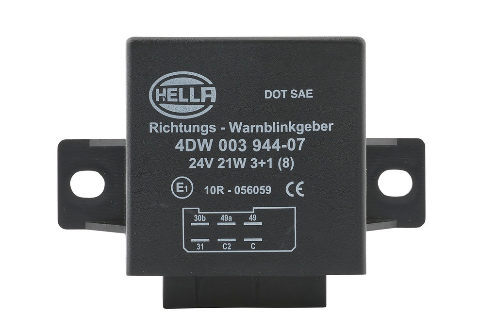 Item Attributes: Mounting Type: PluggedOperating Mode: ElectronicSwitching Capacity: 3+1(8)x21 WNumber of pins: 4 -pin connectorVoltage: 24 VAssembly by qualified personnel required!The HELLA electronics range includes a variety of flasher units in different versions for different vehicle models and requirements. All our products convince through their reliable function and high quality. It goes without saying that our flasher units meet all legal requirements such as those relating to indicator failure detection in accordance with ECE regulations. You can also rely on HELLA's many years of electronics expertise when it comes to flasher units!OE references: AGRIFAC 7700173; EVOBUS 003 544 79 32; EVOBUS A0035445632; EVOBUS A0035447932; FAUN 7751-239; FAUN 99707034833; FAUN 99707751239; GRIMME B94.06995; HOLMER 1020034725; KÄSSBOHRER 7.371.089.000.0; KÖGEL 328479; LIEBHERR 6 301 102 08; MAN 36.25902.0056; MERCEDES-BENZ 003 544 03 32; MERCEDES-BENZ 003 544 56 32; MERCEDES-BENZ A 003 544 03 32; MERCEDES-BENZ A 003 544 56 32; VDL 30119512Flasher Unit;HELLA;4-pin connector;3+1(8)x21W;Plugged;Electronic;24V;