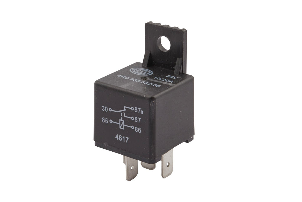 HELLA's quality relays are versatile and always reliable - that's what our many years of original equipment experience and our high level of manufacturing expertise stand for. We produce more than 100 million relays per year in our own production. Renowned car manufacturers have been relying on HELLA's proven quality for decades. The areas of application are varied and include engine control units, headlight cleaning systems, starters, fuel pumps, fan motors, horns and fanfares. HELLA is also certified in various relevant areas, such as DIN EN ISO 9001:2008, ISO / TS 6949:2009, ISO 14001. HELLA relays also comply with the standards of ROHS (2002 / 95 / EC) and REACh. They are available in 12 V and 24 V.Item Attributes: Supplementary Article/Supplementary Info: with holderVoltage: 24 VTemperature range from: -40 °CTemperature range to: 125 °CWeight: 25 gInductive Load: 5 ACapacitive Load: 5 ARated Current: 20 AOhmic Load: 20 ANumber of pins: 5 -pin connectorAssembly by qualified personnel required!