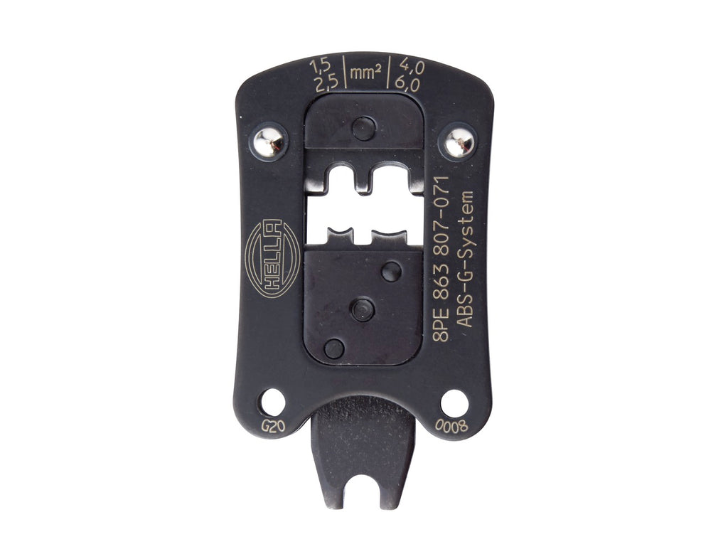 Assembly by qualified personnel required!The "Profi" crimping tool enables particularly precise radial contact processing thanks to its special profile geometries. The perfect positioning of the tool inserts is ensured by the patented crimp set fixing concept. The pliers also have an additional cutting and stripping unit in the handle area which gives the tool set its particularly universal character. The whole thing is rounded off by a modular set of release blades located on the back of the case. The crimping tool is made of hardened tool steel with special surface treatment (of the particularly stressed elements). Individual inserts for the crimping tool and release set can be reordered.Crimping Pliers Insert;HELLA;Profi Typ I & II;Metal;Black;Universal;60mm;025mm;