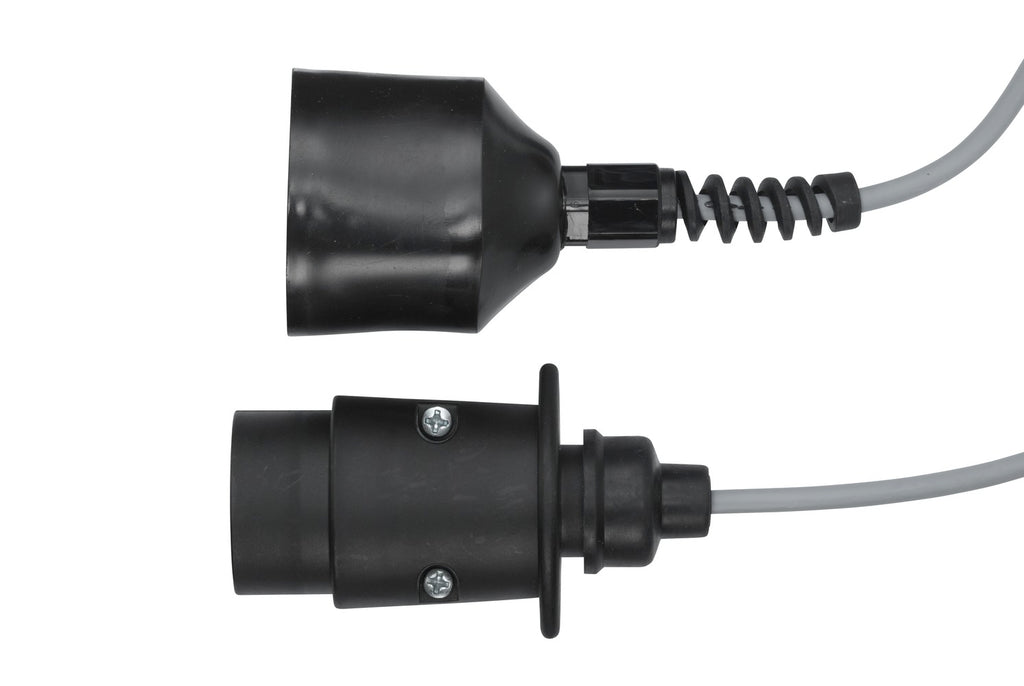 The 7-pin plug-in system 12 V according to ISO 1724 / ISO 3732 is the most widely used system for electrical connections between towing vehicle and trailer with 12 V on-board network. The system is primarily used for applications with average requirements. It consists of a standard connector type N according to ISO 1724 and an additional connector type S according to ISO 3732. The additional system differs from the standard system by its white housing contact inserts and interchangeable contact arrangement.