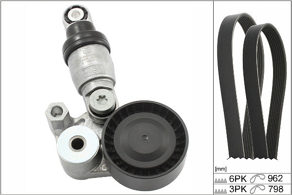 The timing belt system controls the combustion process and the the camshaft drive operation, which opens and closes the valves at the right time. To do this consistently requires accurate tensioning throughout the whole timing belt route, so that all tensioner and deflection pulleys operate in perfect synchronisation. The requirements placed on drive components has continuously increased in the last few years. Higher loads in the engine compartment combined with a longer life expectancy means that garages have to replace all of the belt drive system components at the same time, in line with the recommended change point specified by the vehicle manufacturer.As a technical partner and supplier of complete drive systems to the world's leading vehicle producers, INA offers the widest range of OE content Timing Belt KITs available to the UK aftermarket.INA KITs also contain everything needed for a professional belt system service, right down to the last nut, bolt and washer. If the application features a timing belt driven water pump, INA also offers a comprehensive range of Timing Belt KIT+ Water Pump references to suit.