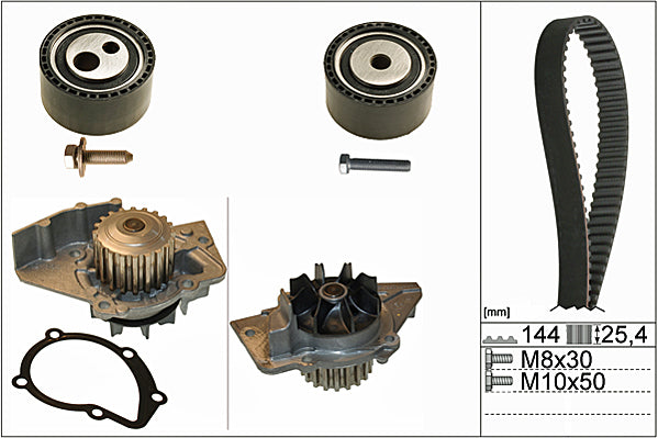 The timing belt system controls the combustion process and the the camshaft drive operation, which opens and closes the valves at the right time. To do this consistently requires accurate tensioning throughout the whole timing belt route, so that all tensioner and deflection pulleys operate in perfect synchronisation. The requirements placed on drive components has continuously increased in the last few years. Higher loads in the engine compartment combined with a longer life expectancy means that garages have to replace all of the belt drive system components at the same time, in line with the recommended change point specified by the vehicle manufacturer.As a technical partner and supplier of complete drive systems to the world's leading vehicle producers, INA offers the widest range of OE content Timing Belt KITs available to the UK aftermarket.INA KITs also contain everything needed for a professional belt system service, right down to the last nut, bolt and washer. If the application features a timing belt driven water pump, INA also offers a comprehensive range of Timing Belt KIT+ Water Pump references to suit.