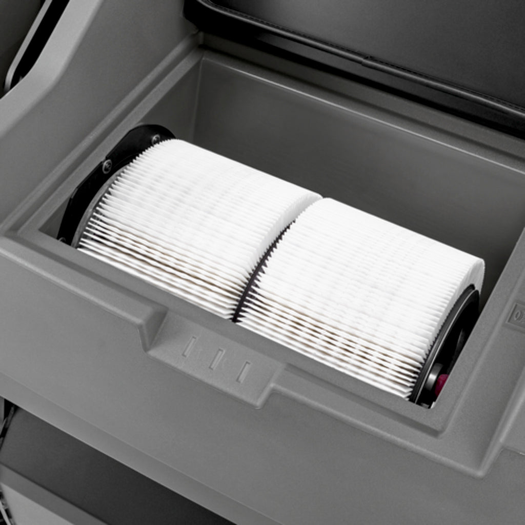 Extremely robust and convenient, with zero-emissions: our KM 100/120 R Bp ride-on sweeper. Equipped with a powerful 240-Ah battery and a corresponding built-in charger for up to four hours of continuous use – even and especially in particularly dusty interior areas. To prevent any damage to furnishings or to the machine itself, the sweeper has a swivelling side brush, the speed of which can be adjusted at any time to suit the quantity of dust to be swept. The floating roller brush ensures excellent cleaning results, the tried-and-tested round filter system with six square metres of filter area and automatic cleaning enables dust-free sweeping at all times, the large waste container allows for long cleaning applications, and the hydraulic high container emptying is perfect for convenient disposal. User-friendly features include the adjustable driver's seat, a very good overview and control elements that are clear and easy to reach. The easy-maintenance KM 100/120 R can also be retrofitted with the optional protective roof or a vacuum holder to suit individual needs.