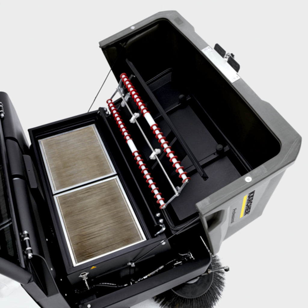 The battery powered KM 130/300 R Bp Pack with three-wheel rear steering operates with low noise and no exhaust emissions. With the dustpan principle, fine waste and coarse dirt are safely vacuumed. The waste container automatically closes during transport. The roller brush automatically adapts to uneven surfaces and can be replaced quickly without tools. A redesigned sweeping system reduces wear and tear. Two horizontally installed flat fold filters ensure clean air even where there are large volumes of dust. Filter cleaning can be done with the push of a button using a highly effective dual scraper. The filter is easily accessible and can be changed without the need for tools. The basic functions can be conveniently selected with a control thanks to the EASY Operation Concept.