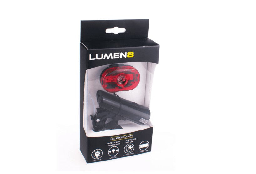 Ideal for commuting and cycling through town, the Lumen8 LED cycle lights set combines a bright 1 watt LED white front light with a 3 LED red rear light with central 0.5W LED.