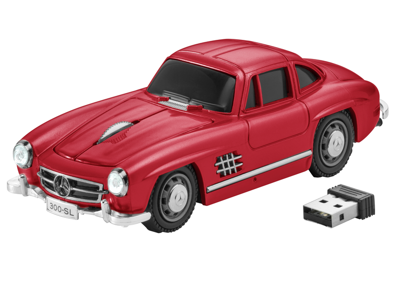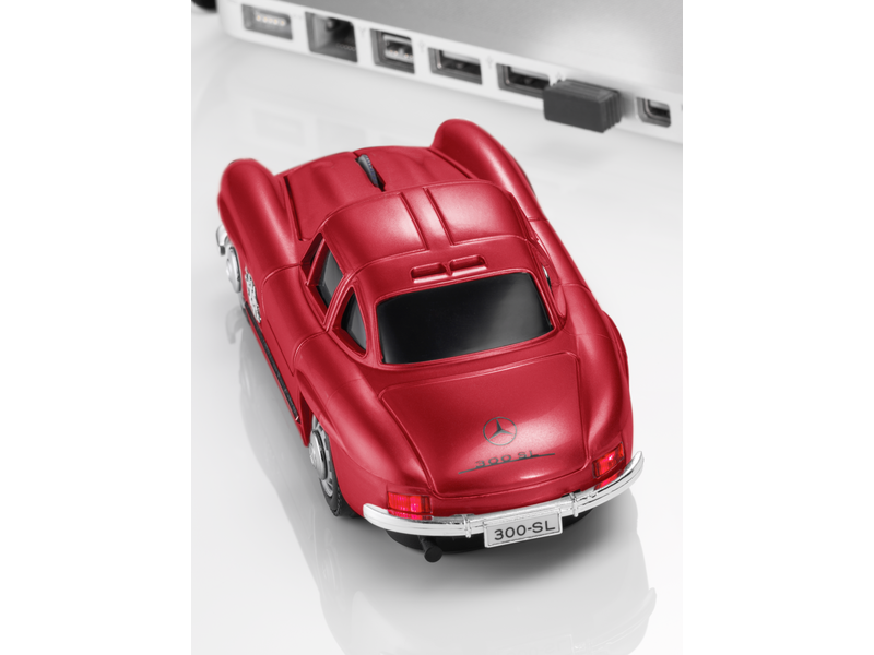 The computer mouse made of red plastic, which is compatible with all common operating systems, comes in the form of a 300 SL. The mouse, which can be connected to the computer in no time at all via Plug & Play, is equipped with 2.4 GHz wireless technology and has high-resolution optical 800 dpi scanning that can be switched to 1600 dpi. A working radius of up to ten meters enables maximum flexibility. A real highlight: the mouse, which is based on the 300 SL, has LED headlights and taillights that can be switched on and off. When used without LED lighting, the mouse can be used for several months.