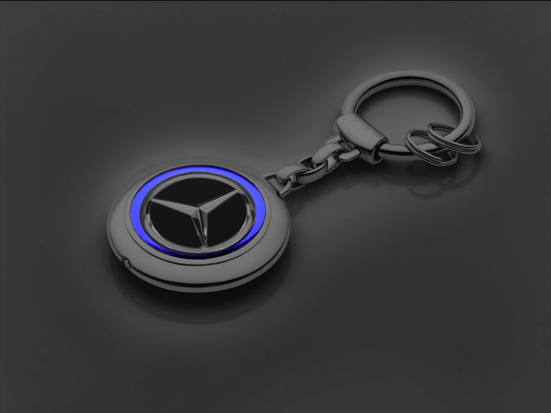 Whether car, apartment or office key: With the illuminated key fob, the most important keys are always at hand. The pendant, which has a glowing blue ring with a coming-home function, is equipped with a key ring that can be opened and closed safely and conveniently thanks to special locking technology and a simple opening function. Three additional mini split rings round off the features and enable individual keys to be changed or removed quickly. The round hand charm with the Mercedes star gives the practical accessory its attractive design.