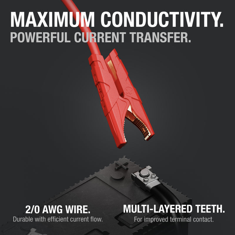 - Designed to efficiently transfer maximum current flow with minimal power loss. Made from durable, heat stabilized 2/0 AWG silicone wire that maintains its flexibility in cold weather environments. Multi-layered clamp teeth allow for more contact points to be on the battery terminal’s surface.
