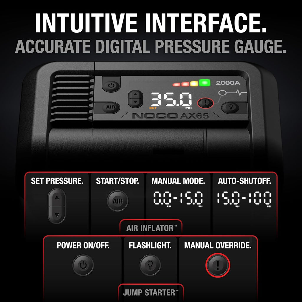 With 2000 amps of power, the AX65 effortlessly jump starts everything from cars and motorcycles to SUVs and tractors, handling engines up to 8.0-liter gasoline and 6.0-liter diesel with ease. AX65 is the next generation of portable air compressors, utilizing advanced motor and airflow design in an unbelievably compact form with uncompromising performance, it runs longer, fills faster, and is infinitely better.