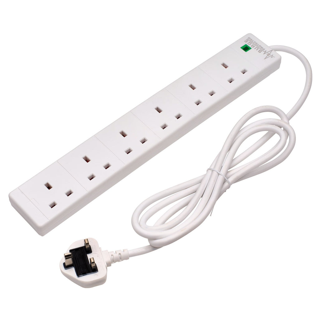 This 6-way extension lead has surge protection to safeguard valuable electrical equipment from surges and spikes. It is ideal for powering computer equipment as well as household appliances. It is also suitable for commercial use. The cable is 2m long. The trailing socket can be fixed to the wall for added convenience and features a neon indicator to show if it is receiving power. It is fitted with a 13A fused UK 3-pin plug and complies with the latest BS regulations. For indoor use.