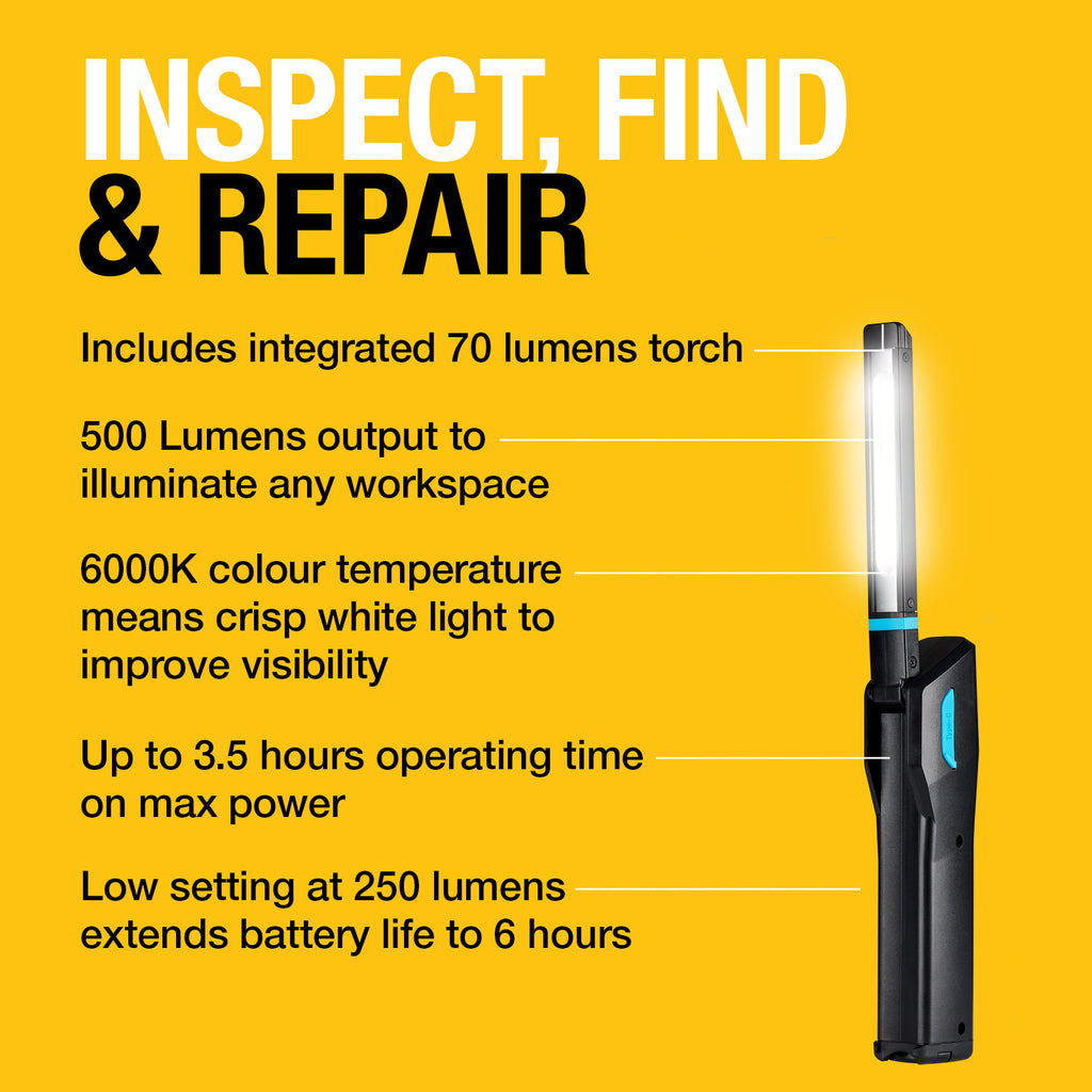 Designed with the professional in mind, the MAGflex Slim500 provides reliability where it is needed the most. This 500 lumen multi-angled slim inspection lamp is tested to IP54 & IK07 and operates for up to 6 hours from a single charge. Ideal tool for any tradesmen needing additional light to work with.