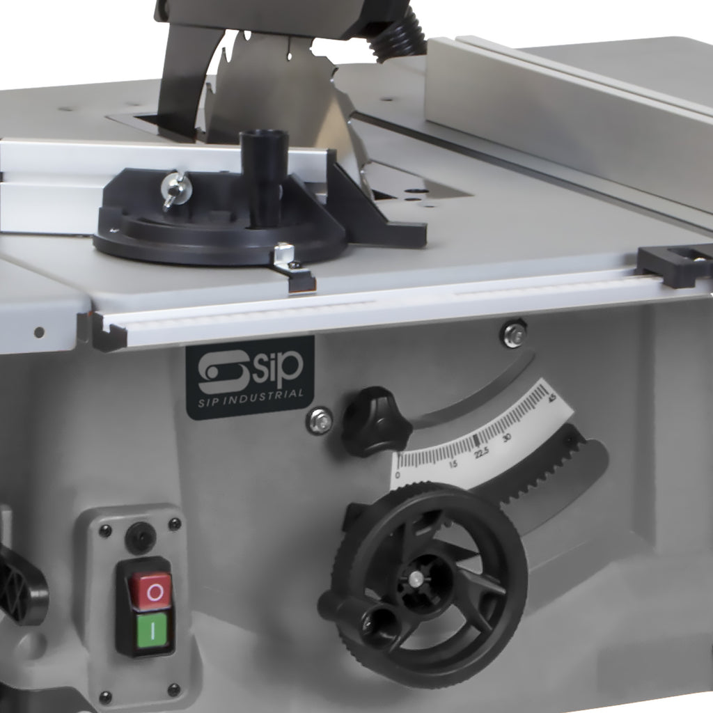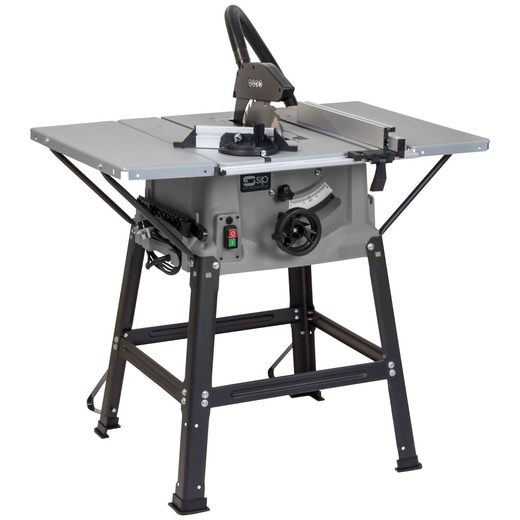 The SIP 10" Table Saw & Stand is fitted with a lightweight plastic body, rise and fall tilting arbor, and 2 rugged side table extensions for a large work area that can accommodate an array of larger timber and irregular-sized pieces.• Powerful heavy-duty motor for high performance• Large 65mm @ 45° / 85mm @ 90° maximum depth of cut• Table with 2 extensions for a large 940mm x 640mm working area• Versatile 0° to 45° full blade tilting capacity• Quick-Lock full length rip fence for accuracy• Integrated NVR switch for added safety• Mitre guide and push stick included• Built-in 35mm dust extraction port• SIP 2-Year Standard Silver Warranty