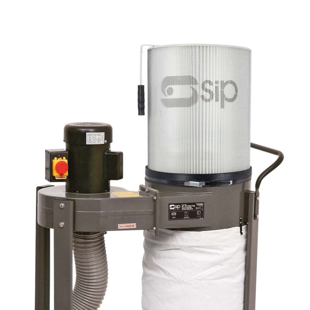 The SIP 1HP Single Bag Dust Collector Package is supplied with a floor attachment and extraction hose to provide easy clean-up and vacuuming wherever it is required, bolstered by a durable wheel-mounted design for easy positioning and versatility.This, combined with powerful filtration down to 5µm, means this dust collector is suitable for all manner of general wood particles.Further filtration down to 1µm is easy through a 62605 SIP 1µm Filtration Cartridge, capturing finer particles including MDF.• 850mtr³/hr working airflow to 57ltr collection bag• Ø 230mm impeller size and 1x Ø 100mm inlet hose size• Robust brushless induction motor for high performance• Effective filtration down to 5µm for general dust particles• 62605 1µm filtration cartridge for finer particles supplied• Floor attachment and robust extraction hose supplied• Wheel-mounted design offers easy unit positioning• Ideal for professional-grade applications• SIP 2-Year Standard Silver Warranty