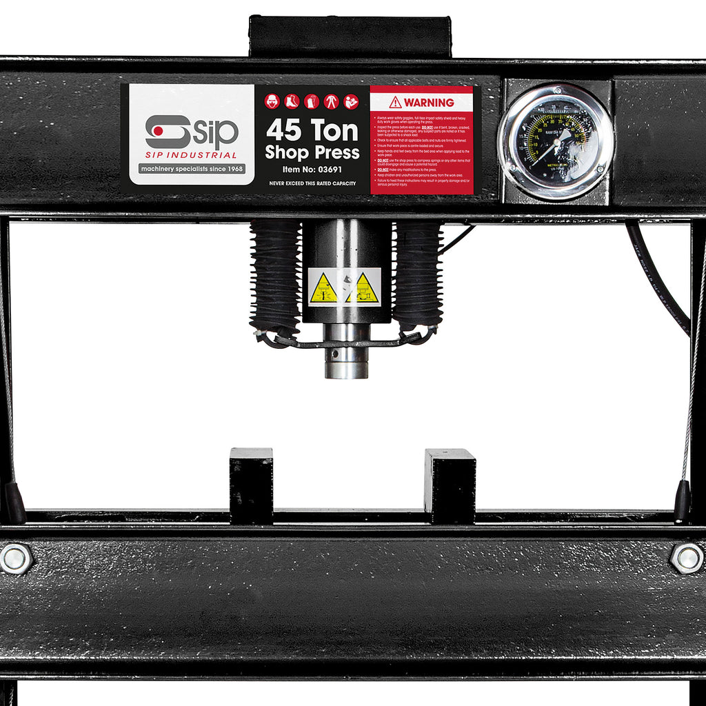 The SIP 45 TON Shop Floor Press is perfect for a variety of applications in garage or workshop applications, offering pneumatically-assisted pressing performance within a robust and exceptionally durable frame, plus a fully adjustable workbed.This press can be used for pressing bearings, bushings or sleeves, bending or shaping metal rods and bars, straightening bent metal, bonding and riveting, punching holes in sheets and plates, or forming sheets into various shapes. It is particularly well-suited for the removal and installation of bearings, wrist pins, universal joints and pulleys.A glycerine-filled manometer helps protect the gauge and provides higher accuracy readings, plus durability against less-than-ideal conditions and corrosion.• 45 TON floor-standing pneumatically-assisted press• 159mm to 859mm work range and a 190mm ram stroke• Heavy-duty steel frame for increased durability• Fully adjustable workbed for improved versatility• Suitable for pressing, bending, bonding and straightening• Bearing, wrist pin, universal joint and pulley removal• Glycerine-filled manometer for durability• SIP 2-Year Standard Silver Warranty