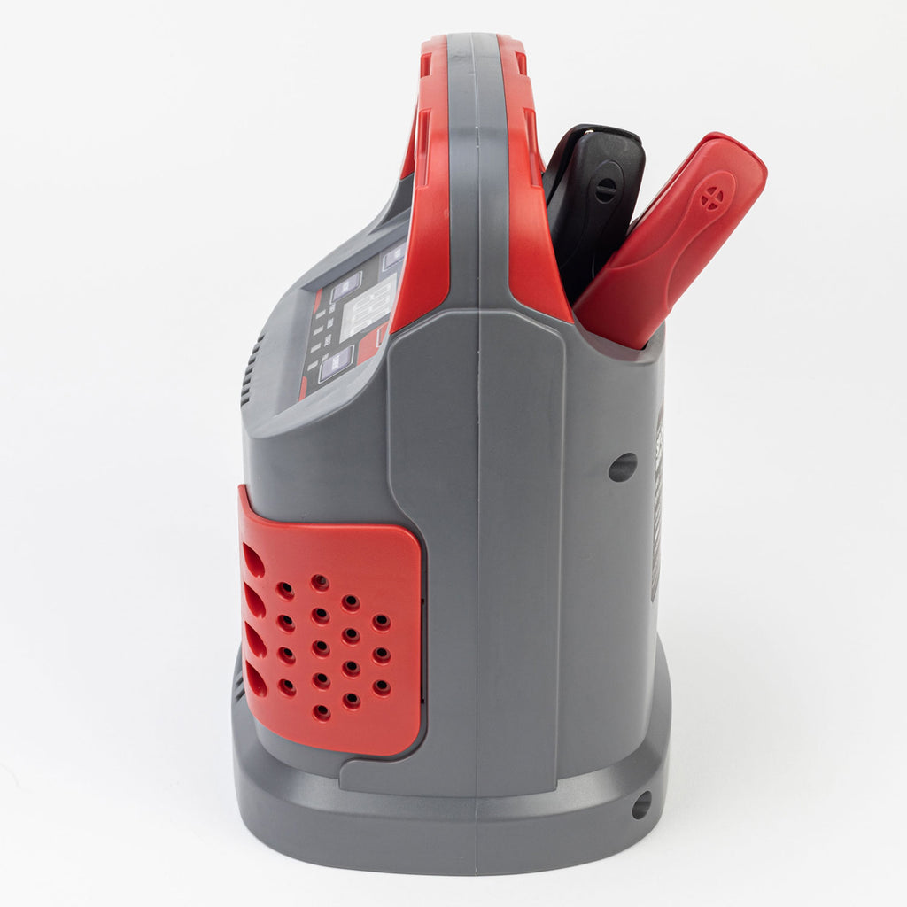 - MICROPROCESSOR-CONTROLLED CHARGER MAINTAINS HEALTHY LONG LIFE BATTERY PERFORMANCE: An intelligent 6-step cycle automatically diagnoses battery condition and voltage before beginning a charging cycle. Once battery capacity is full, the unit stops charging and a control panel light is displayed. If the voltage is less than 3v, the unit prevents charging as battery recovery will not be possible. 'Boost - Fast Charge' mode delivers 5mins of continuous 15A charge. Supplied with 2x 1.2mtr leads and clip clamps. LED display screen and intuitive soft touch control panel. Compact and lightweight design with carry handle for easy movement between use.