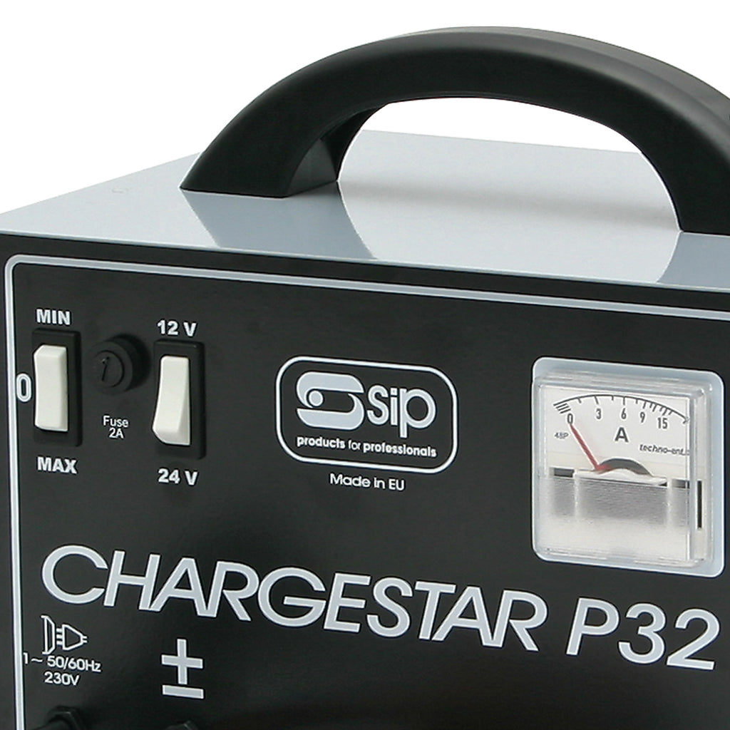 The SIP CHARGESTAR P32 Battery Charger offers powerful performance from a lightweight and compact design complete with durable metal casing. Simply get the charger out the boot, in-vehicle storage or the garage for easy hook-up and operation.The CHARGESTAR P32 is compatible with batteries including Lead Acid, SLA, AGM, GEL, WET and VRLA. It offers 11A rated or 16A max. rated output.Integrated reverse polarity protection provides added peace-of-mind and safety.• 12v/24v dual voltage charging output• Up to 110Ah max. rated battery capacity• 2 charging settings; 11A rated or 16A max. rated output• Lightweight and compact design with durable metal casing• Reverse polarity protection for added peace-of-mind• Quality design including crocodile clamps and leads• Clear and easy-to-read ammeter• SIP 2-Year Standard Silver Warranty
