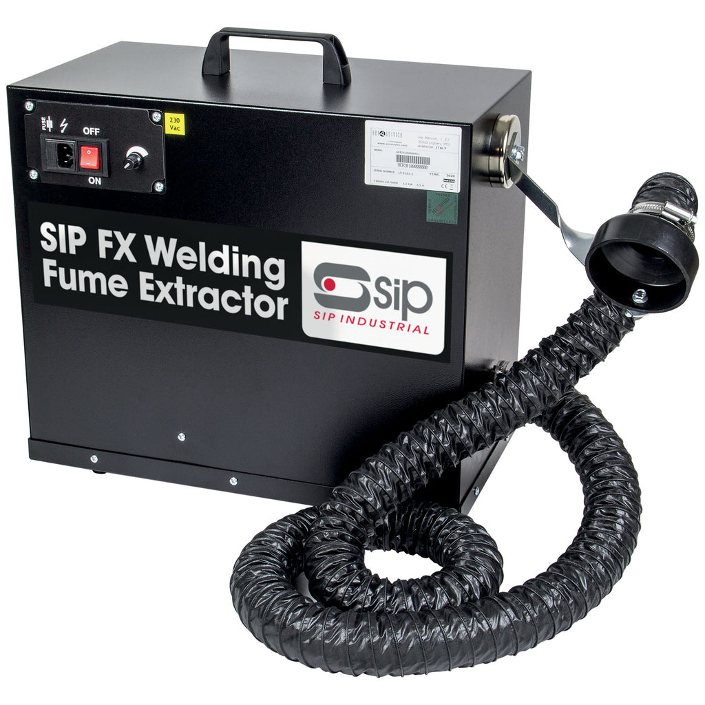 The SIP FX Portable Welding Fume Extractor efficiently and safely removes harmful toxic welding fumes, filtering them and returning clear air into your environment, giving added peace-of-mind that your garage or workshop remains protected and safe.• 250mtr³/hr max. flow rate and 110mtr³/hr max. suction• Adjustable extraction hose for simple positioning• Heavy-duty 3-stage effective filtration up to 85%:- Filter Stage 1: Metallic Spark Arrestors G25%- Filter Stage 2: Cartridge Filter F5 85%- Filter Stage 3: Active Carbon Panel• Harmful fumes are removed through filters with clean air returned• Ensures workshops are protected from potentially harmful toxic fumes• Ideal for intermittent operation with adjustable speed regulation• Complies with all current regulations on weldable materials• Ideal for low and medium concentrations of pollutants• Heavy-duty steel casing with powder-coated finish• SIP 2-Year Standard Silver Warranty• Manufactured in Italy