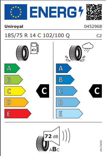 About this tyre - Size - 185/75/14 102Q, Fuel Efficiency - C, Noise (dB) - 72, Wet Grip - C, Runflat - NoAs the only component on your vehicle that actually makes contact with the road surface, tyres are critical for safety when driving.How do you read the markings on a tyre?The markings on a tyre indicate its size, load index and speed rating. A typical tyre marking looks like this - 205/55 R16 W 91. What is the UK legal tyre limit?The minimum tread depth required by law in the UK is 1.6mm. This applies to the central three-quarters of the tyre’s width and its entire circumference. Many car manufacturers, however, advise changing your tyres once the tread is down to 3mm to be on the safe side. What are tyre speed ratings?A tyre speed rating is the maximum speed a particular tyre is legally approved for. The rating is represented by a letter displayed on the tyre sidewall. It will always be the last letter in the sequence.