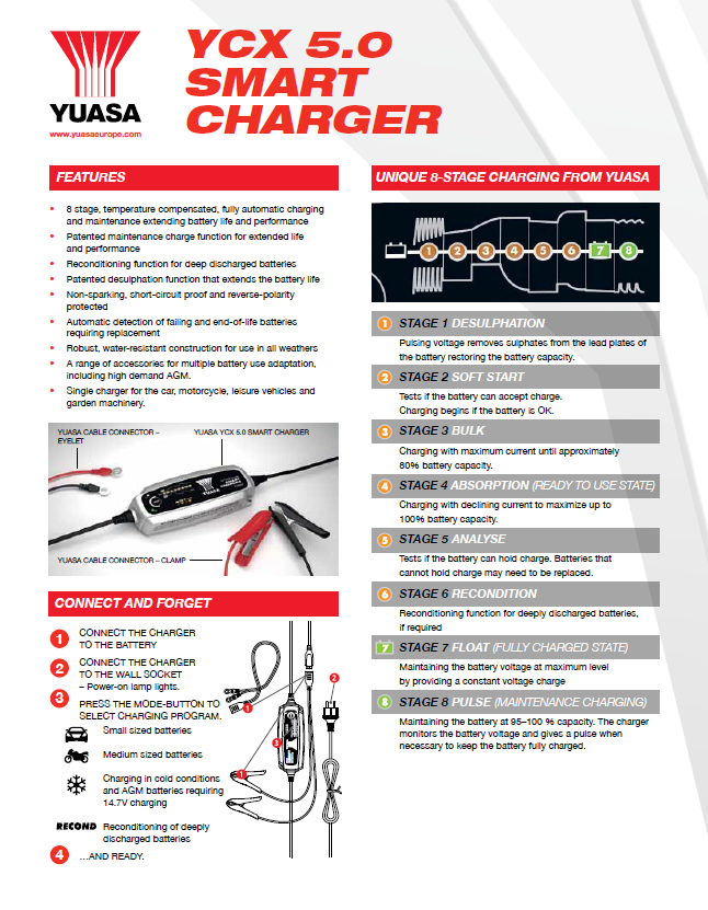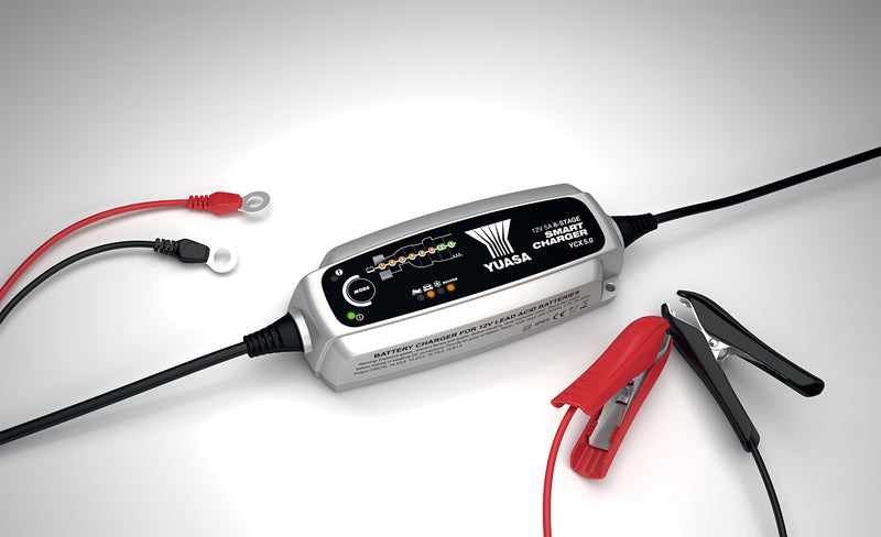 The Yuasa YCX 5.0 is a fully automatic 8-stage Smart Charger delivering selectable 0.8A or 5A to 12V batteries from 1.2–110Ah and is suitable for maintenance charging up to 160Ah including high demand AGM batteries.
